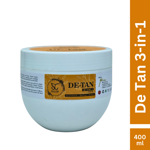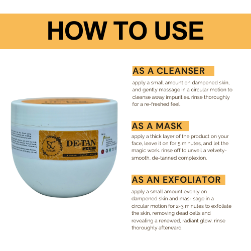 Say goodbye to sun tan and dull skin with our S&C De-Tan 3-in-1, a triple-action skincare hero that functions as a cleanser, scrub, and mask. This versatile formula deeply cleanses pores, removes dead skin cells, and revives tired, tanned skin — all in one step!